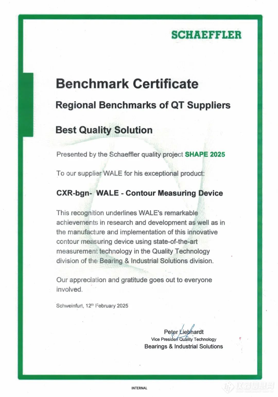 2025年3月,陕西威尔概括仪荣获舍弗勒(Schaeffler)B&IS质量技能认证。